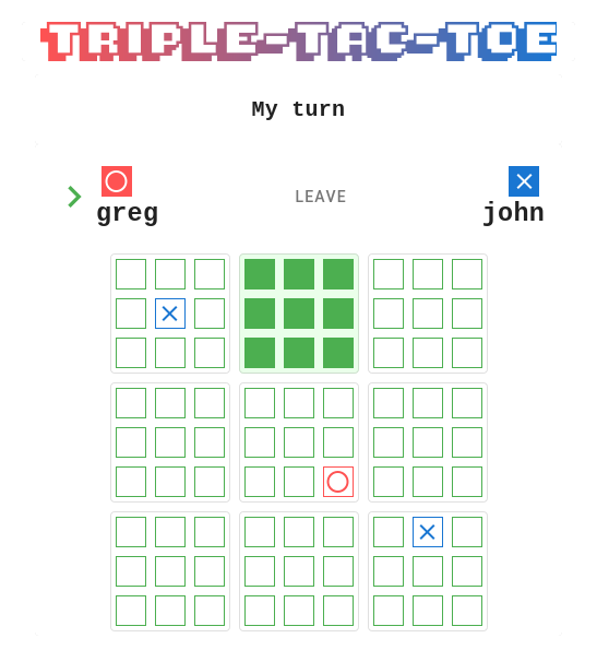 TripleTacToe is a two-player game that follows the rules of the extended version of Tic-Tac-Toe, known as Ultimate Tic-Tac-Toe. You can find the rules here.